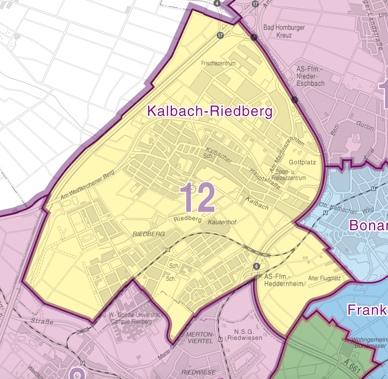 Die Verwaltungsgrenzen des Ortsbezirks legen fest, wo der Ortsbeirat 12 zuständig ist.